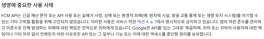 FCM을 이용하여 푸시 알림을 개발할 때 생명에 간접적인 영향을 줄 수 있는 경우로 판단될 시 이용하는 것을 금하거나, 책임은 개발자에게 있다는 내용입니다. 오.. 이건 생각해보지 못한 부분인데 확실히 토큰만료라던지 서버 문제로 앱푸시가 발송되지 않는 경우가 꽤 있어서, 긴급재난문자같은 경우에는 활용하는데 위험도가 있겠다는 생각이 드네요. 이외에도 사용자가 푸시알림을 확인하고 생명에 관련된 판단을 내려야하는 경우에 유의해서 사용해야겠습니다.
